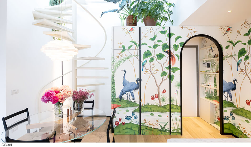 Un approccio confermato anche da Lycia e Gaia Trapani di Lyga Studio, che utilizzano il wallpaper per creare contrasti e punti di forza visiva all’interno di ambienti monocromatici, spesso non rivestiti. «Nei bagni, per esempio, inseriamo wallpaper waterproof all’interno della doccia, creando un fondale scenografico che rompe la neutralità dello spazio e aggiunge profondità». Nel residenziale, la stessa libertà si traduce in soluzioni sartoriali. «Uso spesso carte da parati per rivestire armadi e mobili, privilegiando la ricerca di effetti texturizzati e materici – racconta Clara Bona, architetta specializzata in progetti residenziali – Mi piace creare texture che ricordano i tessuti di un tempo, come rafia o paglia, ma avvalendosi della praticità di materiali facili da manutenere, lavabili e resistenti».