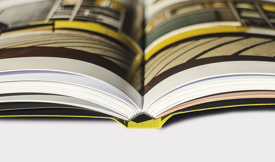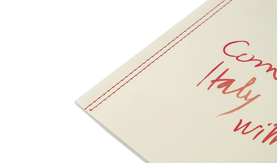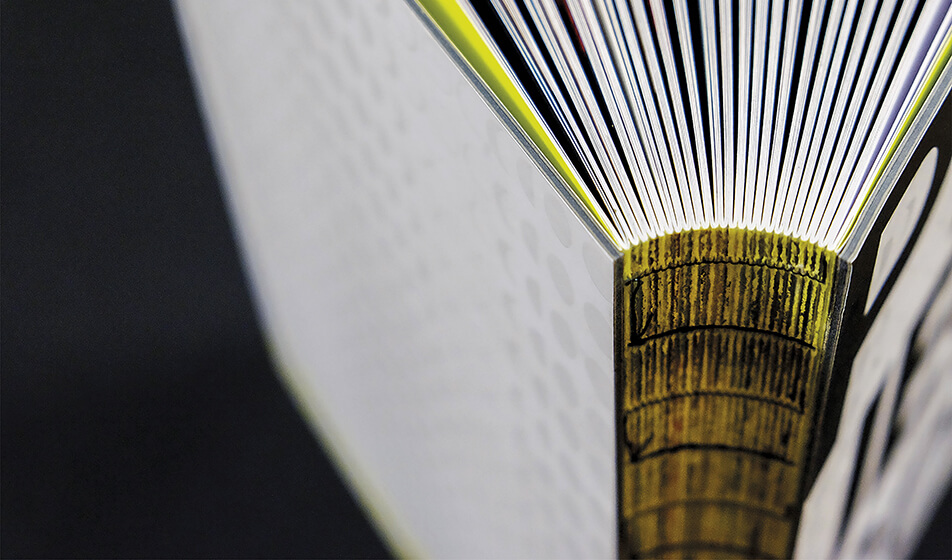 Legatura con dorso libero, in cui il blocco libro non è incollato al dorso ma ai piatti anteriore e posteriore. Si utilizza una striscia di carta o tela per unire le pagine, permettendo un’apertura totale. Le possibilità creative includono la personalizzazione della tela e l’uso di copertine con grammature o larghezze particolari. È una soluzione versatile, ideale anche per prodotti come agende e calendari.