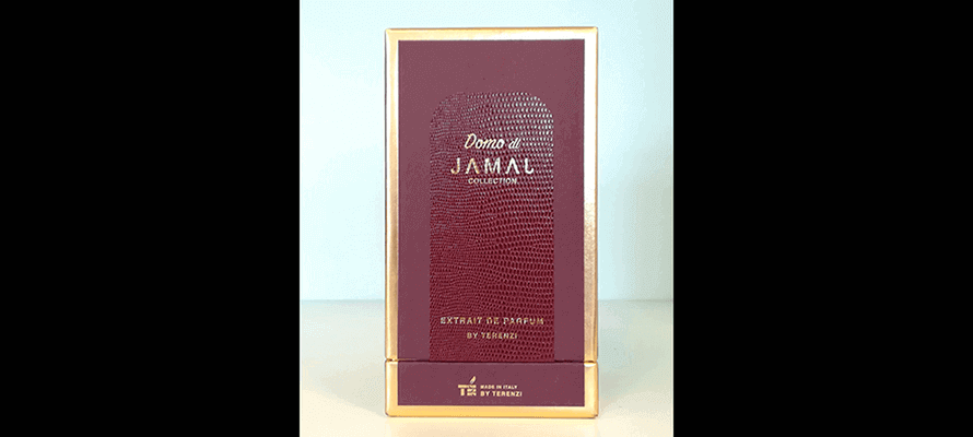 Profumi ipnotici ed emozioni mischiati agli aromi sono sempre state caratteristiche dei prodotti della Cereria Terenzi, che anche questa volta ha creato per la collezione Jamal una profumazione accattivante ed invitante, che si rispecchia nel suo particolare packaging realizzato da Industrialbox: un bordeaux tinto in pasta con linee oro stampate a caldo e a registro non solo sui quattro angoli del coperchio e del fondo, ma anche lungo tutte le cornici esterne del cofanetto stesso, creando così un perimetro oro che lo rende distintivo fin dal primo sguardo.