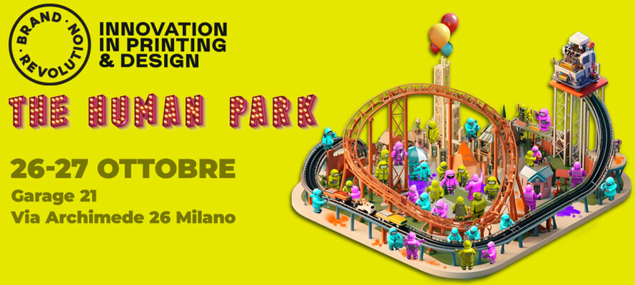 The Human Park, il concept di questa settima edizione, si presenta al pubblico come un parco divertimenti contemporaneo in cui il fattore umano dialoga con l’Intelligenza Artificiale per espandere e aumentare la creatività applicata al mondo della stampa.