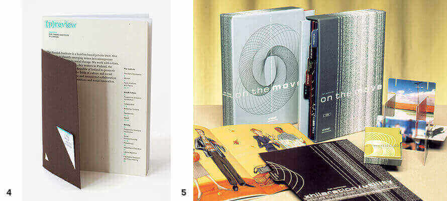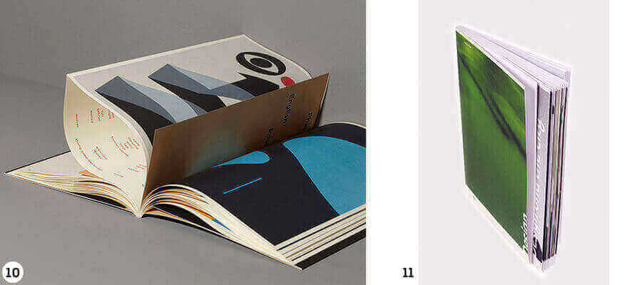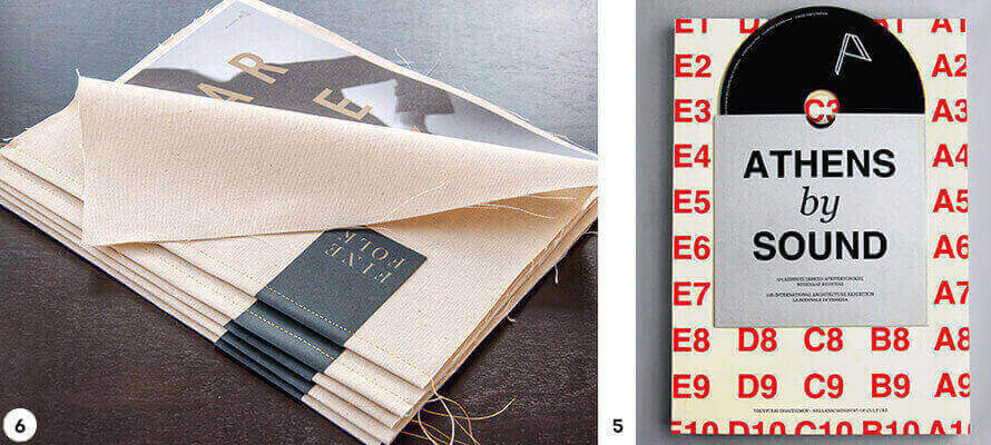 Ma è la brossura, soprattutto fresata, che va indubbiamente per la maggiore. Tipo di copertina e tipo di confezione si influenzano a vicenda: la macchinabilità, anche con materiali particolari o misti (carta e supporti plastici, ad esempio), è sempre molto alta; la fresatura e le diverse tecniche di incollaggio (dalla vinilica alla hot melt, al PUR) garantiscono la tenuta e la possibilità di imbavare facilmente altri stampati (dalle schede in carta o formati diversi a veri e propri fascicoli); i limiti di grammatura e di spessori hanno ampi margini, e in più si tratta di una lavorazione tutto sommato economica che consente anche soluzioni particolari. Quartini, battenti in prima e/o in quarta sono facilissimi da trovare sia nei magazine che nei cataloghi più patinati. Rinforzano la coperta, attirano l’attenzione e consentono foto estese su coperta e battenti. Ma ci sono possibilità meno esplorate come sfruttare la prima di coperta per accoppiarci un porta-cd come ideato dall’agenzia inglese Company per il catalogo Athens By Sound commissionato dal ministero del Turismo greco (07), o il battente in quarta, chiuso in testa che si apre verso l’alto, che per essere realizzato richiede la fustellatura. Non mancano esempi anche nell’editoria: Bompiani ha collane con brossure con gli angoli stondati (08), mentre Mondadori mezze-tele brossurate e tagliate al vivo per la collana “900 Italiano” (09).