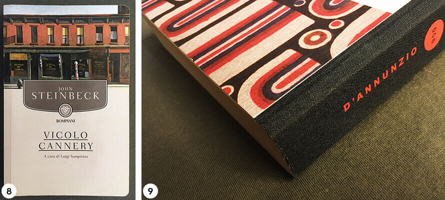 Adelphi, di contro, doppia di fatto la copertina tenendone una interna senza stampa in carta più pesante e incollata al dorso alla sovraccoperta stampata; Mondadori di fatto alza la difficoltà sfruttando sapientemente il taglio: negli Oscar 451 i volumi hanno doppia copertina e la sovraccoperta esterna non solo è fustellata in prima, ma ha l’aletta in quarta refilata con il blocco libro a formare un segnalibro (23).