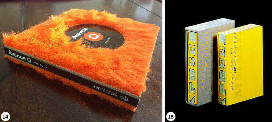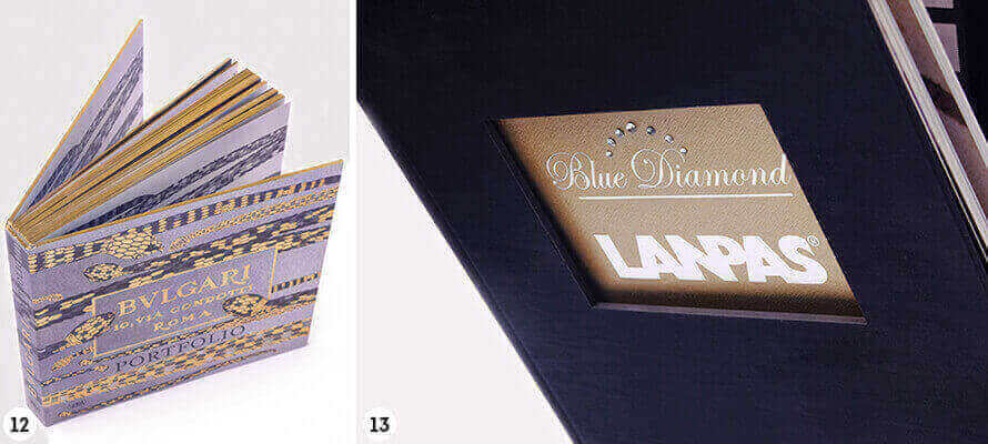 Diversamente da quello che potrebbe sembrare, la versione cartonata di una copertina non è necessariamente la versione nobile della brossura fresata. Oggi più che mai il cartonato ha invaso anche fasce più basse del mercato: si fresa il blocco libro, volendo si mettono i capitelli, e si incassa senza bisogno per forza di cucire le segnature. L’effetto è lo stesso, il costo è inferiore e si libera budget per gli effetti speciali. In fondo, potrebbe non essere così indispensabile la tenuta di una brossura cucita. La copertina cartonata è composta da una plancia di carta o di altro materiale, la quale riveste due plance in cartone grigio unite dal corpino del dorso. Solitamente le plance sono leggermente più grandi rispetto al volume a formare un’unghia, e rimboccate, e tutta la copertina è tenuta insieme al blocco libro dai risguardi, quartini accoppiati alla II e III di copertina e incollati alla prima e l’ultima pagina. Insomma, di elementi con i quali creare varianti ce n’è in abbondanza. Si può giocare con i materiali come nella mezza-tela, tagliare al vivo tutto il volume e lasciare a vista il cartone delle plance, che non necessariamente deve essere grigio, ed esaltare le pagine con un taglio colore su tutti i lati come in un portfolio per Bulgari (12). Si può sbalzare la plancia, imprimerla a caldo e applicare un’immagine in uno scasso, fustellarla per mostrare parte della I romana, come il catalogo Blue Diamond confezionato per Lanpas da Gruppo Padovana con tanto di strass applicati (13); o accoppiarci un tessuto “peloso” come è stato fatto per il libro dedicato al musical Avenue Q con protagonisti i Muppets (14).