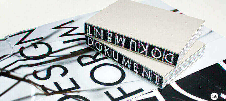 Si possono usare i dorsi, tenendoli tondi, quadri o addirittura fustellarli come nel catalogo della School of Visual Arts di New York realizzato dallo studio americano Poulin + Morris (15), fino a farli scomparire del tutto, mettendo a nudo parti che normalmente sono semilavorati. Destrutturare lo stampato è ormai una tendenza, un gioco di bravura per design e legatori. L’incollatura a vista richiede di solito una legatura filo refe. In pratica le segnature, piegate e cucite, vengono solo incollate e non incassate. L’idea è quella di entrare nel processo industriale con la colla e il filo a vista, enfatizzando anche l’aspetto tattile, e in più sfruttare la cromaticità della carta, del filo o della stampa come ha fatto la graphic designer Isolde Fitzel per la pubblicazione Dokument per il Design Forum di Vienna (16). Arrivando perfino ad annullare quasi del tutto la copertina, come in un volume di Legatoria Berto dove segnature e coperta sono indistinguibili (17).