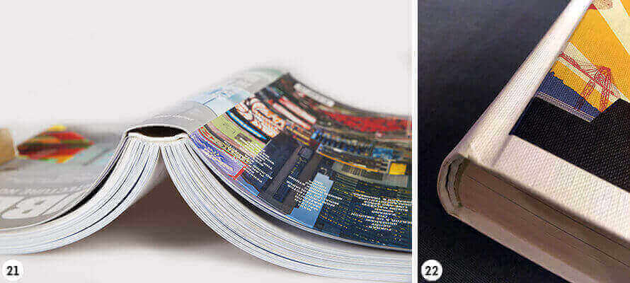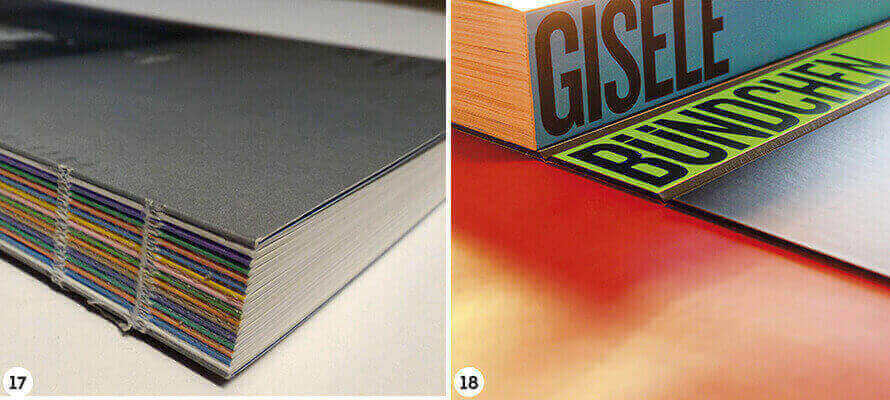 Il dorso a vista si può fare anche senza cucire: dopo la piega le segnature non vengono fresate per sfibrare la carta e creare miglior appiglio per la colla, ma tagliate a schede che vengono incollate in modo da formare una superfice piana sulla quale stampare, tampografare o serigrafare come nel celeberrimo volume Gisele Bundchen di Taschen che tecnicamente è un cartonato svizzero con tagli a 45° e il blocco libro è incollato sul dorso (18). Il virtuosismo può spingersi fino al dos-a-dos in cui le plance del cartonato sono 3 e i dorsi 2 come nel libro fotografico Bailey+Rankin dello studio Rankin Photography (19).