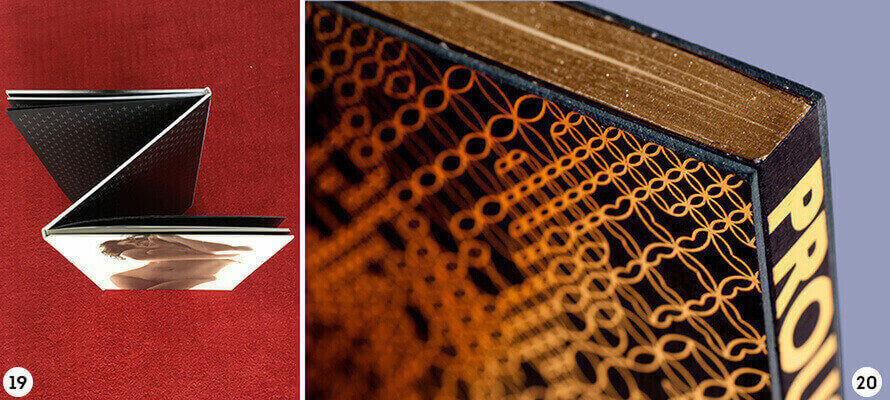 È comunemente definita “bodoniana” una rilegatura che unisce copertina, dorso e retrocopertina tramite i risguardi nella parte interna e la garza sul dorso. Esempi molto eleganti sono la monografia dei 40 anni di Velux ideata da Elena Ziletti e realizzata da Intergrafica Verona o il volume Saloes de Paris dell’editore brasiliano Carambaia che raccoglie 21 saggi di Marcel Proust, con tela nera e taglio colore in oro (20).