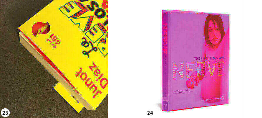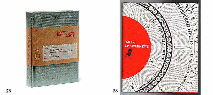 La rivista online nerve.com per il decennale pubblica un volume ricoperto in vinile magenta trasparente termosaldato con una stampa a caldo (24). Un bel gioco è la fascetta di Quantum of Solace di Penguin della serie di 007: il volume si presenta come un dossier dell’Mi6 e come tale ha i testi impressi su carta kraft, come battuti a macchina, il timbro dell’editore a secco e il timbro del protocollo (25). Ardita è la scelta di Art of McSweeney’s, numero commemorativo della rivista edita dall’omonima casa editrice, la cui narrazione inizia proprio dalla sovraccoperta rimboccata con i risvolti pari che fa anche da poster (26).