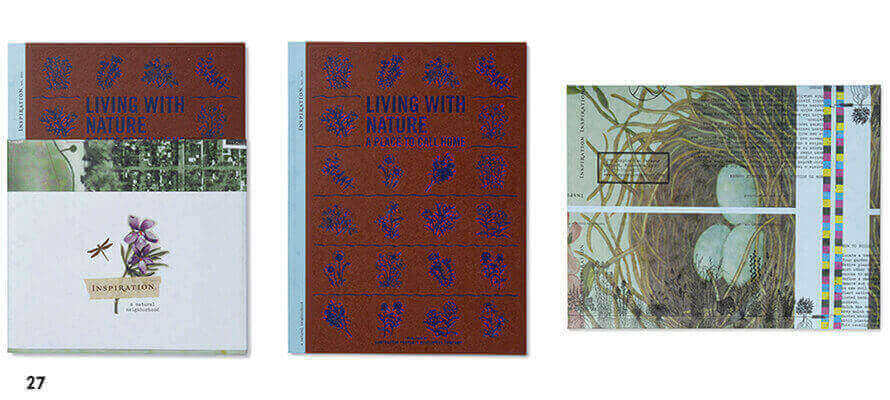 Un mix ben riuscito di nobilitazioni e uso creativo della brossura è il volume Living With Nature, composto da segnature french-fold brossurate in carta naturale, coperta stampata a 3 colori con impressioni a caldo in foil blu e una sovracoperta all’americana anti-strappo che, se stesa, forma un poster, più corta e battuta al piede del volume (27).