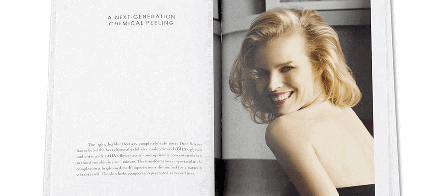 Nel sistema dei mezzi che comunicano il lusso il catalogo riveste un posto del tutto speciale: è una specie di ‘luogo del deside-rio’ che si sfoglia per lasciarsi sedurre da tutte le immagini e i segni di un brand, a cui le tecnologie di stampa possono dare intensità tattile, magia, luce. Vero e pro-prio distillato di sollecitazioni sensoriali, esemplare nella raffinatezza del design, il prestigioso catalogo illustrato in questa pagina, dedicato ai prodotti Dream Skin Avanced di Dior è prodotto da Nava Press in occasione della presentazione alla stampa internazionale della nuova linea. È ricco di immagini suggestive, valorizzate dalle car-te utilizzate e fecondate di bellezza dalle finiture.