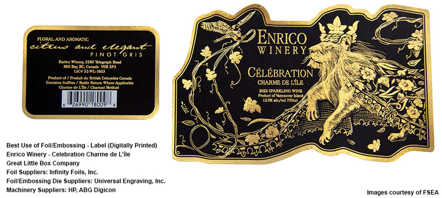 Le etichette di lusso rappresentano un altro segmento in crescita, poiché riescono a trasformare qualsiasi articolo promozionale in un capolavoro da collezione. L’etichetta della cantina canadese Enrico, prodotta dalla Great Little Box Company, ha vinto il premio come Best use of Foil/Embossing – Etichetta (Stampa digitale) di quest’anno. I suoi partner, Infinity Foils, Inc., Universal Engraving, Inc., HP e ABG Digicon, hanno contribuito a creare un’etichetta accattivante per il loro spumante Celebration Charme de L’île.