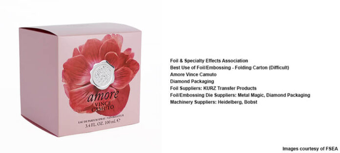 Esempi concreti dimostrano l’efficacia di un approccio di lusso. Il team della Foil & Specialty Effects Association (FSEA) ha recentemente premiato il team di Amore Vince Camuto per la miglior applicazione di foil/rilievo su astucci pieghevoli, con una confezione firmata Diamond Packaging e realizzata con prodotti di KURZ, Metal Magic, Heidelberg e Bobst. Questo è un esempio di come trasformare una semplice scatola in un oggetto da collezione.