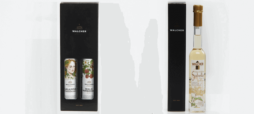Longo SpA ha realizzato due scatole per la Distilleria Alfred Walcher, eccellenza altoatesina della produzione di grappe, acquaviti e liquori che vanta anche una linea biologica.