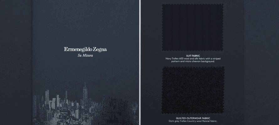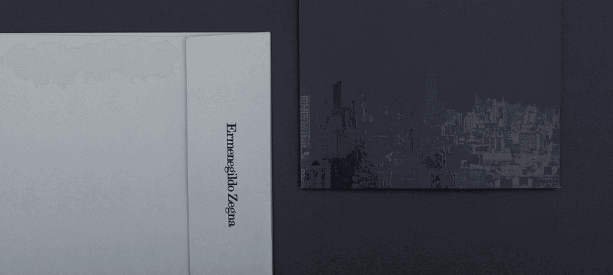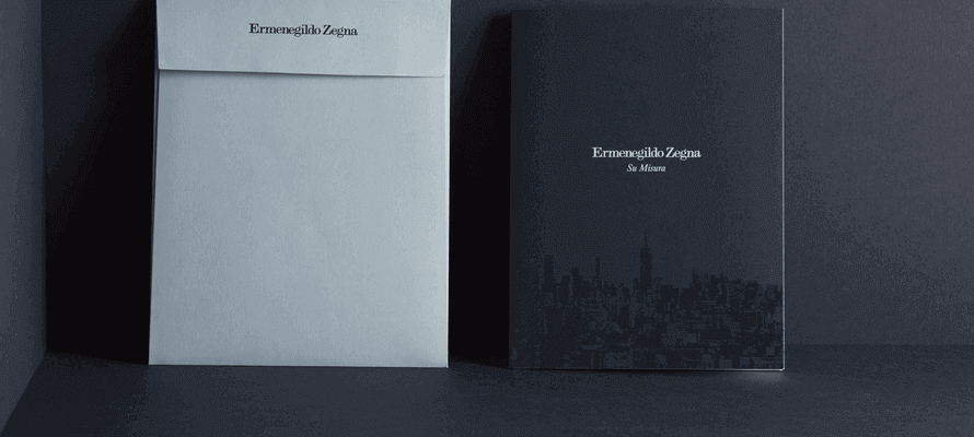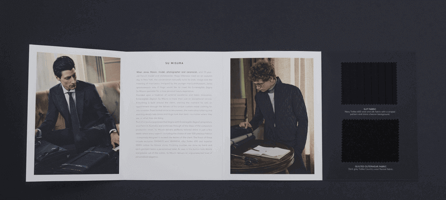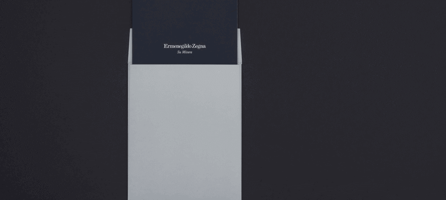 L’esclusivo servizio “Su Misura” di Ermenegildo Zegna è presentato come un invito esclusivo: un pieghevole a quattro ante stampato su carta Olin Rough Absolute White 300 gsm, custodito da una busta celeste realizzata con la medesima carta in grammatura da 170.