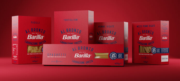 Con Al Bronzo, il brand Barilla è protagonista al centro della confezione diventando una cosa sola con il nome del prodotto. Il logotipo è stato ridisegnato non solo in vista di una maggiore leggibilità, ma per un tratto più assertivo, chiaro e soprattutto “senza tempo”. Per la prima volta la data diventa parte integrante dell’identità, per celebrare il 145esimo anniversario della Food Company italiana più longeva e riconosciuta nel mondo. L’intero restyling è volto a ridimensionare la forte propensione in avanti della marca, legata a valori di performance e prestazione propri di un altro periodo storico, recuperando invece una rinnovata simmetria, espressione di solidità, centratura, presenza e attenzione per la qualità.
