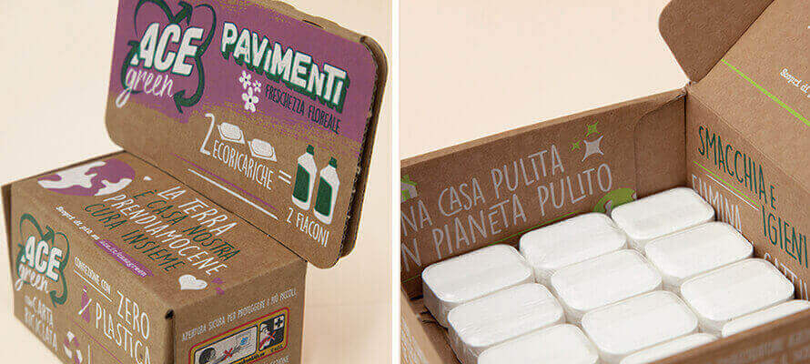 Antonella Manenti, Art Director of HENRY & CO., the firm specialising in sustainable design that created Yousea’s packaging, explains that “acidity is a key issue in-home care, even more so than in cosmetics. All packaging must take this into account, especially when we have concentrated active ingredients. Another factor is the frequency of use of the product, so we can think about packaging degradation times based on preservation requirements, taking advantage of the characteristics of bioplastics. The other aspect, says Gianluca Carone, Senior graphic designer at DLVBBDO who created the ACE Green identity, is moisture resistance. “Not only for powders but also for liquid and solid concentrates, moisture is a relevant factor: it is essential to use materials with barrier capacity. Obviously, the new packaging must guarantee the same resistance to water-attack and protection from sunlight as traditional packaging, so we have preferred sealed packaging without large openings to the outside. We have chosen packaging made of planar flexographic printing, which is then die-cut, set up in paper converting and finished by offset printing.” Eco-design principles are an essential guide in the design of packs in terms of both materials and shapes, as Pierluca Urbinati, one of the two founders of Officina Naturae. This Rimini-based company has created special flat-shouldered bottles for its products to reduce the amount of air transported as much as possible and make full use of pallet space, all using a bioplastic derived from sugar cane waste since 2014.