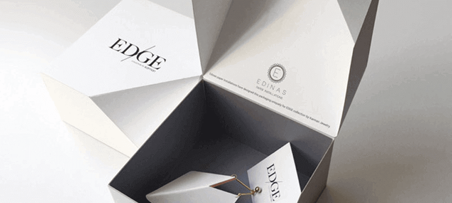 Il packaging sviluppato per la collezione Edge utilizza forme geometriche poliedriche che rimandano alle forme dei gioielli contenuti all’interno. L’imballaggio risulta interessante per la modalità di utilizzo delle pieghe che forniscono rigidità strutturale al packaging permettendo un ridotto uso di collanti e creano un’alternanza di linee nette e facce piane ed irregolari i cui rombi e triangoli instaurano un legame formale ed espressivo con il prodotto.