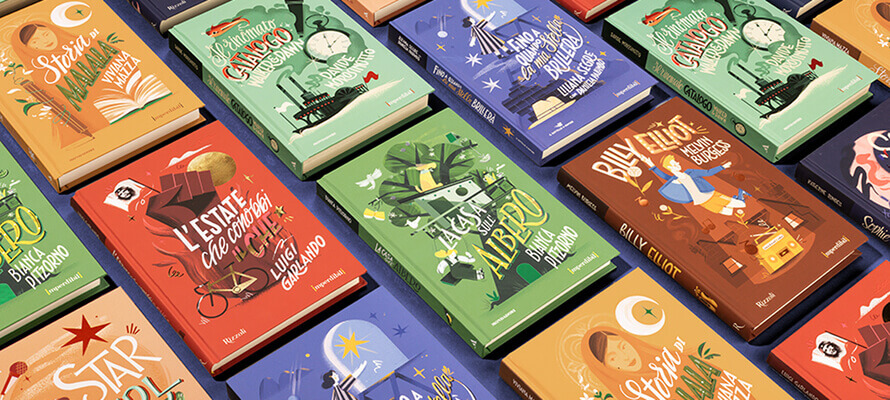 Ma un mercato in crescita significa anche un mercato affollato, in cui la competizione per gli occhi e l’attenzione è altissima. Per questo la progettazione dell’albo illustrato guarda anche ad altre discipline, come ad esempio il packaging design. Emanuele Basso, Direttore creativo dell’agenzia The6th, ci parla di come la propria esperienza sul lavoro di marca sia stata messa al servizio di oggetti che devono essere in grado di raccontare una storia, intrattenere, piantare un germe di curiosità sul mondo: «Siamo stati contattati da Stefano Moro e Fernando Ambrosi, art director che lavorano all’interno di Mondadori Ragazzi per lavorare su una nuova collana. Si tratta di una serie di titoli appartenenti a diverse case editrici del gruppo – Mondadori Libri, Il battello a vapore e Rizzoli – riuniti all’interno di una raccolta che mettesse insieme i “nuovi” classici, i libri contemporanei che negli ultimi anni si sono aggiunti al canone per ragazzi. Si trattava di dare loro una veste grafica che riflettesse questo status di classici moderni. Abbiamo lavorato su Gli Imperdibili con un mix di illustrazione e hand-lettering, utilizzando lettering diversi che riflettessero il carattere del testo, ma accomunati da uno stile che tenesse insieme il senso generale della collana. Quello che distingue l’editoria ragazzi da altre aree della produzione editoriale – prosegue Basso – è il modo in cui si presentano come oggetti, con una forte componente visuale che è parte integrante dell’identità del testo. Un aspetto che è emerso durante il lavoro è che alcune soluzioni di comunicazione visiva mutuate dal packaging design risuonavano particolarmente con l’immaginario della fascia 13-15 anni. Nel momento in cui abbiamo discusso le possibili soluzioni, un punto importante che è stato sottolineato è il fatto di non concentrarsi solo sulla forza delle immagini, ma di ragionare da subito su una serie di soluzione di nobilitazioni che rafforzassero le immagini e aiutassero i libri a risaltare sugli scaffali delle librerie. È una battaglia che si gioca sul colore, con tutti gli strumenti a disposizione della nobilitazione e della cartotecnica.