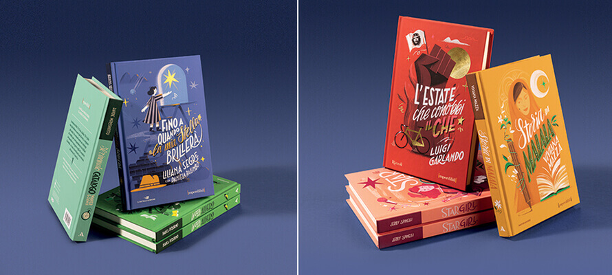 Le copertine della collana sono plastificate opache soft touch, sia per la resa tattile che per far risaltare le lamine colorate e le lucidature su elementi del fronte e della costa. Abbiamo usato la lamina per mettere in risalto gli elementi iconici della narrazione, sia ripresi da edizioni precedenti che avevano particolarmente colpito la fantasia dei lettori, che da altri adattamenti della storia, come ad esempio il poster del film nel caso di Star Girl di Jerry Spinelli.