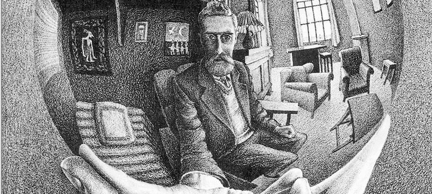 A giocare sul concavo e il convesso, indagando sull’illusione di una realtà speculare fatta di sovrapposizioni, è stato Maurits Cornelis Escher (1898-1972), che ha studiato direttamente il tema dell’illusione generata sulle superfici. Con il celebre autoritratto, Mano con sfera riflettente (1935), Escher ha creato una concatenazione infinita tra ciò che l’autore disegna e ciò che è disegnato. Il soggetto che sta disegnando, l’artista stesso, è infatti riflesso in una sfera, la quale a sua volta, ne contiene un’altra e un’altra ancora, e così via all’infinito. Un’opera emblematica, costruita come un vero e proprio selfie, a partire dall’inquadratura che, oltre al volto, riprende anche il braccio teso dell’artista a sorreggere la superficie riflettente.