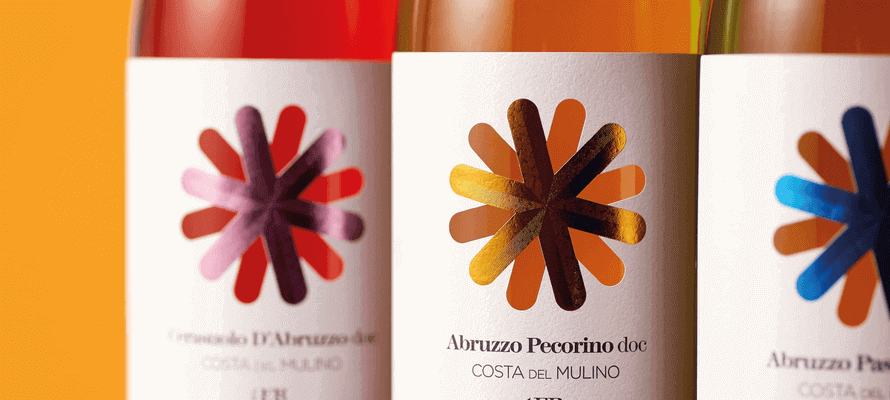 L’origine del nome Costa del Mulino è da rintracciare nell’esistenza di mulini ad acqua nel tratto della costa dei trabocchi, area dove insistono diversi vigneti della cantina. Per il nuovo corso, Dispenser reinterpreta la grafica della ruota del mulino, rendendola l’elemento centrale dell’etichetta, in combinazione con un gioco di fustelle e lamine metalliche dalle tinte forti. Ciascuna etichetta viene completata dalla sua capsula in polilaminato anch’essa impreziosita con un gioco di lamine di diverso gradiente cromatico sempre coordinata con la lamina utilizzata nell’etichetta. Il risultato garantisce un deciso impatto a scaffale coerentemente con la strategia di riposizionamento.