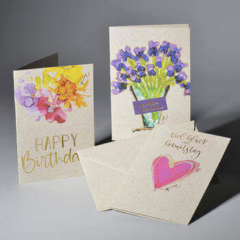 ‘It was an exciting challenge to print and convert this new style of paper. Thanks to our long experience in print production, we have achieved an impressive print result. In fact, it was the natural look and feel of this paper that initially attracted us to it’, said Harry Steiner, production manager at ABC. Indeed, the card producer’s printing skills bring the flowers and colourful designs to life on the grass paper. Each card is also embellished with a touch of gold foil to emphasise the various occasions represented by the cards.