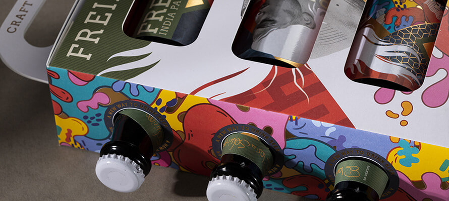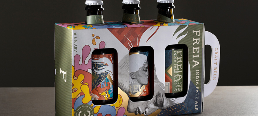La realizzazione del packaging secondario perfettamente abbinato all’etichetta è l’altro aspetto che ha coinvolto La Commerciale. Il packaging, che può contenere fino a 3 bottiglie di birra Freia, è stato realizzato in due parti separate. La parte esterna è stata prodotta su carta Arena Smooth White 200 g/m2 sempre di Fedrigoni Paper accoppiata a cartoncino teso. Nei lati ricorrono le geometrie e le decorazioni con graffiti astratti e colorati che già erano presenti sull’etichetta mentre sul retro si ritrova il volto femminile come protagonista. La parte interna è stata realizzata sempre su carta Arena Smooth White 200 g/m2 accoppiata in questo caso a microonda. L’intero packaging non presenta punti colla in quanto ha una struttura interamente automontante. Sia la componente esterna del packaging sia quella interna sono state realizzate in quadricromia con stampa offset UV per la realizzazione dei fondi colorati molto brillanti abbinati alla lamina a caldo oro della stessa tonalità presente sull’etichetta adesiva. Questo è un chiaro esempio di come poche lavorazioni ben concepite possano produrre un risultato fresco, dinamico e… semplicemente wow.