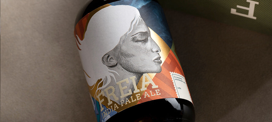 Freia, Freya, Freja, Freija, è multilingua, multiculturale, è una donna a Bergen, Haiti, Lahasa a Locri. Ha molte manifestazioni e nomi ed è considerata la dèa dell’amore, della bellezza, della seduzione, della fertilità, della guerra, delle virtù profetiche. Il concept per l’etichetta parte dal nome scelto, che rimanda alla mitologia norrena. L’ispirazione prende spunto da un immaginario mistico e dalle virtù profetiche che avvolgono le manifestazioni di questa divinità rielaborandole in chiave contemporanea. La seduzione è espressa nelle laminazioni dell’oro che sono in superficie e nella ricerca di un profilo femminile non ingentilito ma, al contrario, tratteggiato da lineamenti forti, quasi come fosse una guerriera a riposo. La contemporaneità di questa figura femminile viene messa in risalto anche dallo sfondo con cui è in dialogo. Un tappeto di geometrie, disegni astratti e Graffiti Art intersecate fra di loro in un gioco di linee e morbidezze che ricordano il dolce e l’amaro. La carta utilizzata per l’etichetta è di Fedrigoni Self-Adhesives, in particolare è stata scelta la linea Premium White WS Barrier, una carta ultra white che grazie alla tecnologia Barrier crea un filtro, una vera e propria barriera, tra la carta e l’adesivo in grado di garantire un’ottima resistenza agli sbalzi termici. L’etichetta abbraccia una bottiglia creata da Gruppo Saida che nella forma richiama il mondo delle trappiste belghe. Il packaging è stato realizzato con la carta Arena Smooth White di Fedrigoni Paper. Sia l’etichetta che il packaging, stampati da La Commerciale, sono nobilitati con il colore a caldo LUXOR® MTS 495.