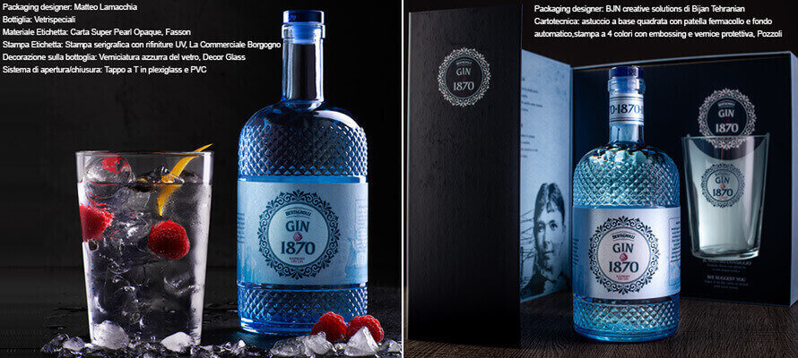 Una bottiglia per ogni distilleria e spesso una bottiglia per ogni etichetta di gin prodotta dalla stessa distilleria. In Italia si contano centinaia di etichette e tantissime distillerie artigianali che si muovono con disinvolta agilità fra multinazionali e grandi aziende, grazie a un’inventiva audace ed esuberante, espressa nel prodotto tanto quanto nel packaging e nel suo corredo di etichette, decorazioni, chiusure-gioiello, mini monografie e astucci appositamente costruiti per celebrare l’unboxing experience. Anna Boschi, che opera nel marketing della Distilleria Bertagnolli, ci spiega il concept che ha ispirato il packaging design del loro gin: «Nel 2019, con l’avvicinarsi del centocinquantesimo anno di attività della Distilleria Bertagnolli, è nata la necessità di rinnovare la linea celebrativa che rendeva omaggio alla fondatrice Giulia de Kreutzenberg che, assieme al marito Edoardo Bertagnolli, fondò la distilleria a Mezzocorona nel 1870. È nato così Gin 1870 – Raspberry Dry Gin, un gin al lampone, pepe, ovviamente ginepro e altre due botaniche segrete, custodito in una bottiglia dalla diamantatura fine ed elegante, che richiama il periodo della Belle Époque. L’etichetta evocativa avvolge interamente la sezione centrale della bottiglia e riporta sul fronte una cornice circolare in cui è inserito il nome del prodotto e il logo Distilleria Bertagnolli 1870 accompagnato dal nuovo payoff “cuore trentino”, nato in occasione del restyling dell’intera rosa dei prodotti Bertagnolli. L’etichetta istoriata narra di come Giulia de Kreutzenberg sia venuta a conoscenza del prodotto gin; in stile litografico sono rappresentate alcune scene di questa felice storia, nonché la foto della nobildonna ritrovata negli archivi storici della distilleria. Il tratto distintivo è la verniciatura azzurra della bottiglia che si sposa con la cromia dell’etichetta e del tappo in plexiglass. Completa la vestizione della bottiglia un collarino che riporta l’anno di fondazione».