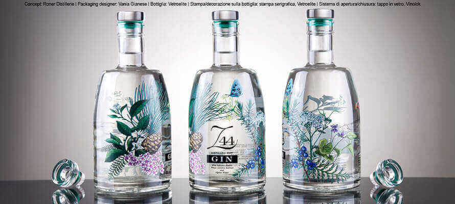 Percorriamo pochi chilometri e in Trentino troviamo un altro gin, un’altra identità, un’altra storia. Ce la racconta Simon Schweigkofler, responsabile marketing di Roner Distillerie: «Abbiamo affidato al design la narrazione della storia del nostro Alpine Gin Z44, la cui particolarità è il cirmolo (in tedesco Zirbel) raccolto sul Cono Bianco vicino alla nostra distilleria a un’altezza di 1850 metri. Il contenitore trasparente, infatti, mostra la montagna ricoperta di neve, riprodotta sul retro della bottiglia. L’illustrazione racconta le botaniche alpine tipiche dei boschi che ci circondano e che donano al gin un aroma inconfondibile. La natura, gli ingredienti genuini e il nostro forte legame con il territorio sono gli elementi identificativi del brand, che attraverso le illustrazioni sono stati sviluppati nella rappresentazione grafica».