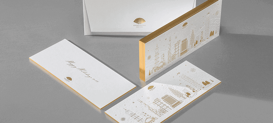 Le greetings card sono corredate da buste minimal e raffinate, con il logo dell’hotel impresso in lamina oro, ottenute tramite fustella personalizzata su Favini Prisma Flux White 170gsm.