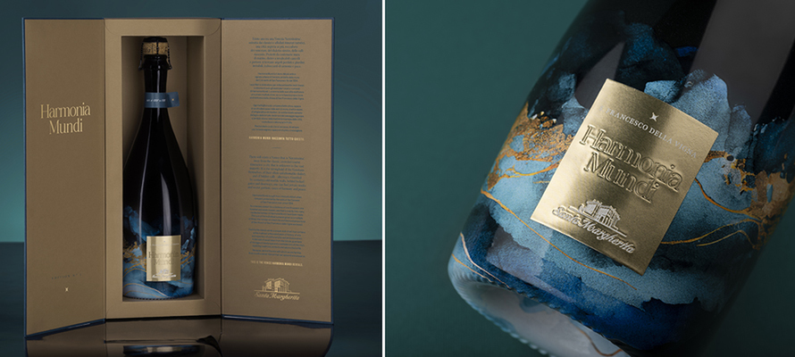 Harmonia Mundi nasce dal più antico vigneto urbano di Venezia, il Convento di San Francesco, fondato nel 1254. Il progetto di vinificazione si distingue per l’approccio biologico e per la valorizzazione delle tradizioni locali. Ogni bottiglia è un pezzo unico, impreziosito da un listello di legno di briccole esauste, recuperato dalla laguna e trasformato in materiale pregiato. Questi listelli, che sono naturalmente irregolari e alterati dal tempo, conferiscono alla bottiglia un carattere inimitabile, simboleggiando la fusione tra passato e presente. La bottiglia è decorata con una tecnica di sublimazione, che permette di ottenere una resa cromatica vivida e durevole sulla superficie del vetro, senza alterarne la trasparenza. L’etichetta, invece, è in alluminio adesivo, scelto per la sua eleganza e per le sue proprietà di resistenza agli agenti atmosferici. Una scelta che garantisce una superficie lucida e riflettente, in grado di enfatizzare i dettagli grafici e di conferire alla bottiglia una sensazione di raffinatezza.