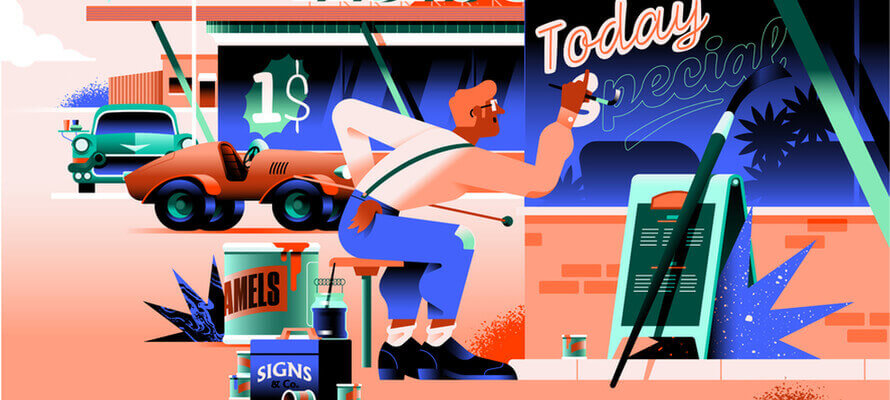 Man mano che si sfoglia il calendario si apprezzano varie forme e intensità di colori: dal Modernismo del mese di marzo con le sue sfumature gialle, verdi e turchesi (tipiche degli anni Quaranta), all’atmosfera Rockabilly di aprile con, in primo piano, un grafico pubblicitario impegnato a disegnare un’insegna dalle forme tondeggianti.