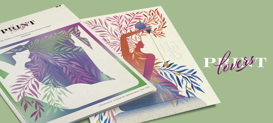Almost as if it were a hymn to Spring, for the Print97 back cover, Varigrafica offers an H-UV offset print in delicate and full-of-life colours in the guise of a woman. The special effect created using MyFlora-Up Olivestone paper is further enhanced by hot stamping with Lumafin® 799 Clear, a dense weave of translucent leaves that refer to an incorporeality that fills the page. Other enhancing elements are the gold pearls in Luxor® 427, and here too, the olive daughters of Elais are created through a hot-printed cliché. Lastly, the woman’s body comes to the reader through an exchange of different thicknesses and heights. In this way, the embossing, intertwining with the paper, gives our Goddess a three-dimensionality that engages and touches the viewer.