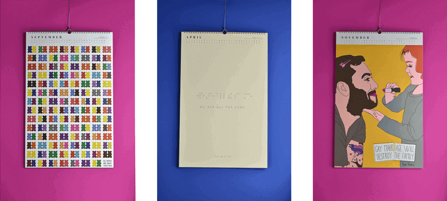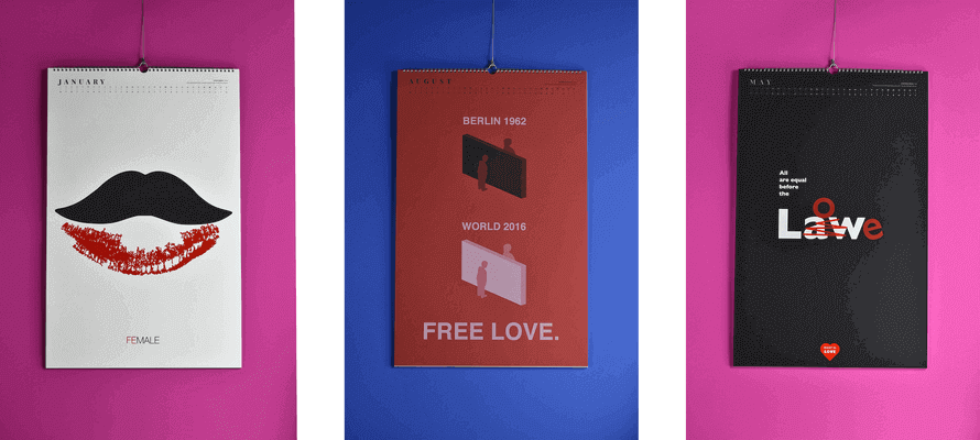 “Rights in Love” è il titolo del calendario 2018 di Posterheroes stampato su carte Favini, che raccoglie i 40 poster selezionati nella sesta edizione del concorso di grafica sociale, dove il tema era il diritto di amare.