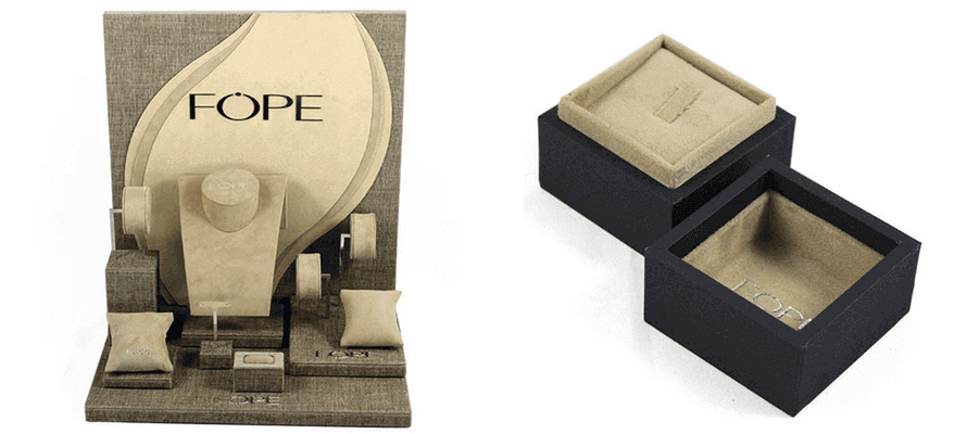 Per questo ci affidiamo da anni a un’azienda di Verona, In the box, una cartotecnica che lavora nel mondo del lusso e per molte griffe. Per noi realizzano scatole e astucci, destinati a contenere anelli, bracciali, collane, orologi – compresi quelli che vendiamo con l’e-commerce – che hanno una struttura in legno rivestita di tessuto. All’interno viene utilizzata l’alcantara con un colore che richiama quello della pelle umana proprio per esprimere al meglio la visibilità del gioiello indossato. Si tratta di materie prime tutte completamente made in Italy compreso il cartoncino della sovra scatola. In the box realizza anche i nostri espositori, anch’essi in tessuto dalle tonalità beige e le carte da parati con le quali allestiamo i punti vendita e che richiamano la classica maglia Novecento di Fope, in versione 3D e l’ambiente casa.