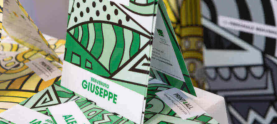 Graphicscalve ha realizzato un invito alla fiera completamente personalizzato, che rende il visitatore unico e riconoscibile. Grazie alla tecnologia di stampa digitale HP Indigo e al software creativo Mosaic, partendo da sei colori dell’esacromia e da una texture di base e utilizzando ridimensionamento, trasposizione, rotazione e shuffle di colori sono state generate sei diverse versioni che identificano la categoria di appartenenza del visitatore. Questa tecnologia infatti, da uno schema di base, consente di creare centinaia, migliaia e persino milioni di grafiche uniche per un’esperienza cliente memorabile.