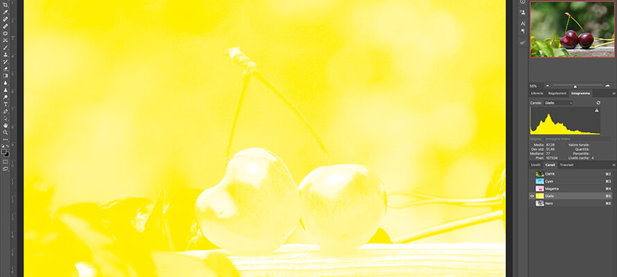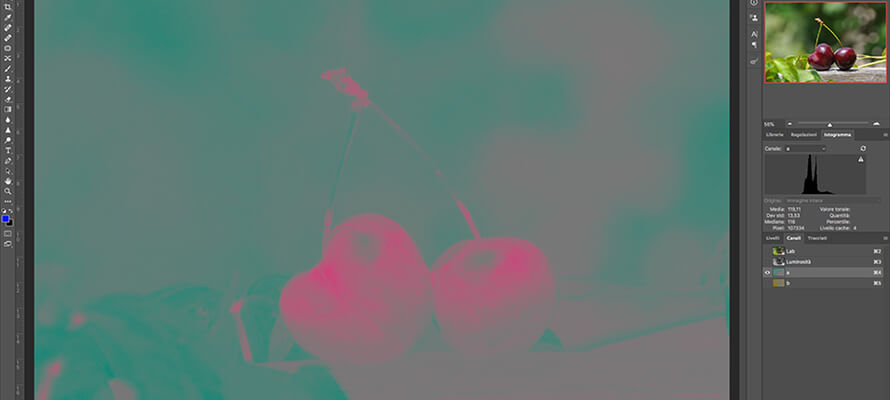 A scanso di equivoci, sottolineiamo che passare da qualsiasi metodo di colore al LAB non comporta nessuna alterazione cromatico e l’immagine sembrerà esattamente la stessa: proprio perché LAB contiene tutti i colori possibili, non può verificarsi alcun deterioramento della qualità dell’immagine poiché tutti i colori vengono tradotti inalterati. Inoltre, per Photoshop il LAB è una sorta di spazio colore nativo: infatti, ogni volta che un’immagine viene convertita da RGB a CMYK o viceversa, passa in background attraverso il LAB. Una volta convertita l’immagine, se guardiamo i Canali avremo un canale senza colore (L), più due canali con una doppia combinazione di colori (verde+rosso per il canale a e giallo+blu per il canale b) entrambi privi di contrasto. Torniamo a quanto detto sopra: L determina la chiarezza, ovvero quanto l’immagine è chiara o scura, mentre il canale a è il bilanciamento del colore tra verde e magenta, e il canale b è il bilanciamento del colore tra blu e giallo. Nei punti in cui il canale è di un colore o dell’altro c’è uno squilibrio, nei punti in cui appare grigio medio, c’è un equilibrio tra i due colori. Come con qualsiasi tipo di correzione cromatica in Photoshop, non esiste una formula fissa perché ogni immagine è diversa dall’altra così come il gusto dell’operatore. Però gli interventi sulle curve o sui livelli possono essere fatti esattamente come si fa in RGB, con la differenza che si ragiona in termini di luminosità e di bilanciamento tra i colori, esattamente come vorrebbero LightRoom, Affinity o CaptureOne.