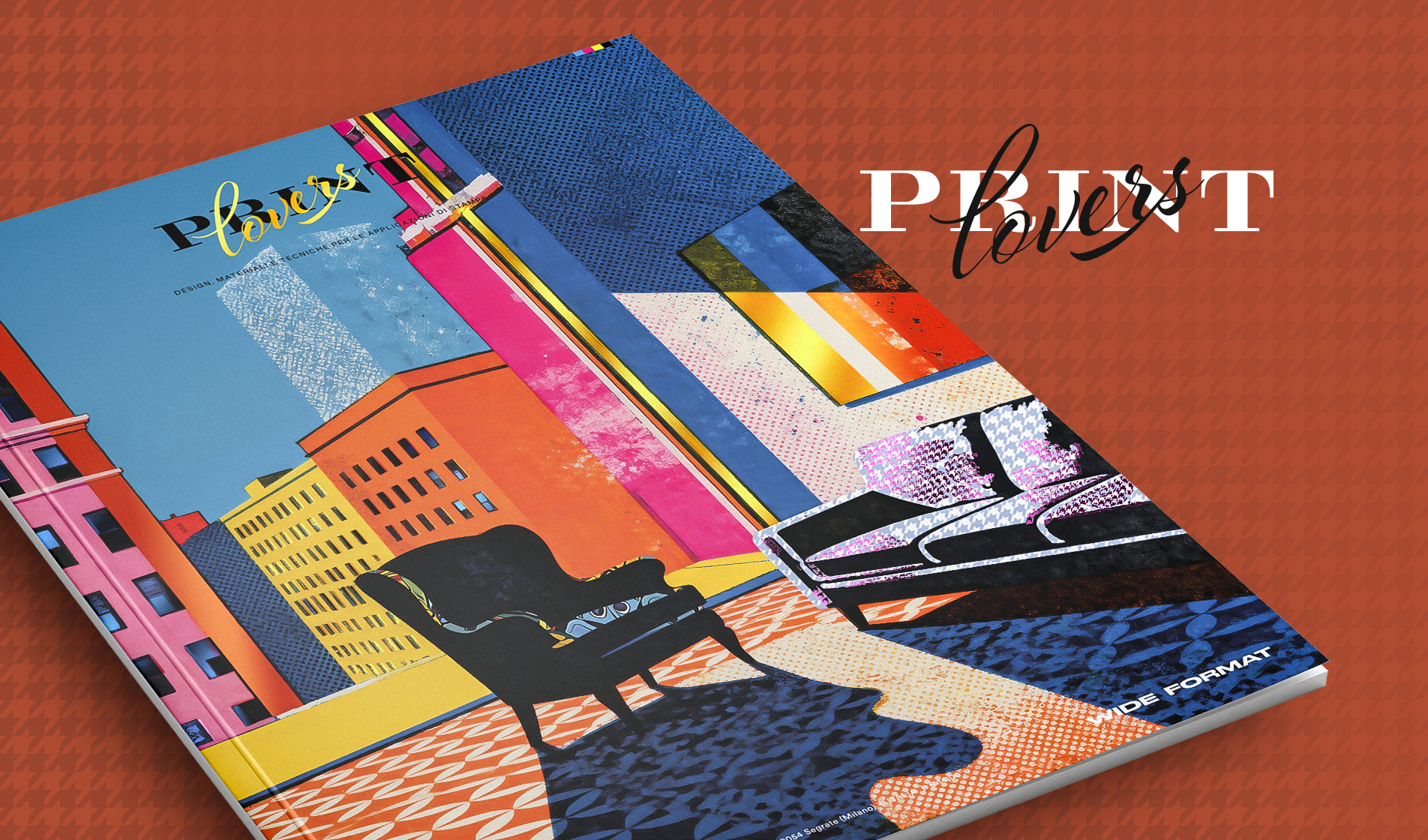 La cover è stata stampata da Ba.ia srl in offset a 4 colori con l’aggiunta di un Pantone e riserva in vernice su alcuni dettagli architettonici della grafica. Sono stati utilizzati 4 foil a caldo di Oropress per impreziosire e far emergere le linee verticali e i dettagli delle texture degli arredi presenti nel design grafico che racconta il Wide Format
