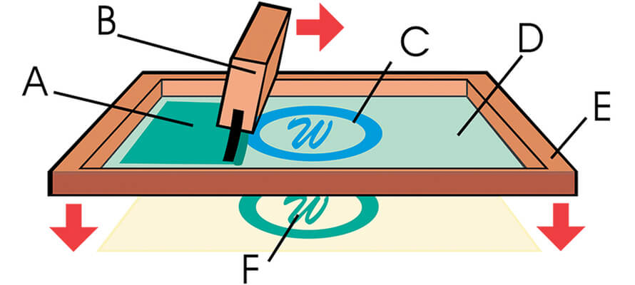 Il telaio così preparato è pronto per la stampa. Viene montato su un banco serigrafico che assicura la giusta stabilità e una pressione uniforme durante la stampa, mentre il supporto da stampare viene posizionato sotto il telaio. Si versa l’inchiostro serigrafico nella parte superiore del telaio (A) e con una spatola, detta racla (B), si spinge l’inchiostro attraverso la rete del telaio, esercitando una pressione uniforme. Solo le aree del disegno libere da emulsione consentono il passaggio dell’inchiostro, depositandolo sulla superficie sottostante e creando l’immagine desiderata (F). Una volta completata la stampa, il telaio viene sollevato per separarlo dalla superficie stampata che viene fatta asciugare, e così via, copia dopo copia. Alla fine della tiratura il telaio può essere conservato per usi futuri o lavato dall’emulsione per essere impresso nuovamente.