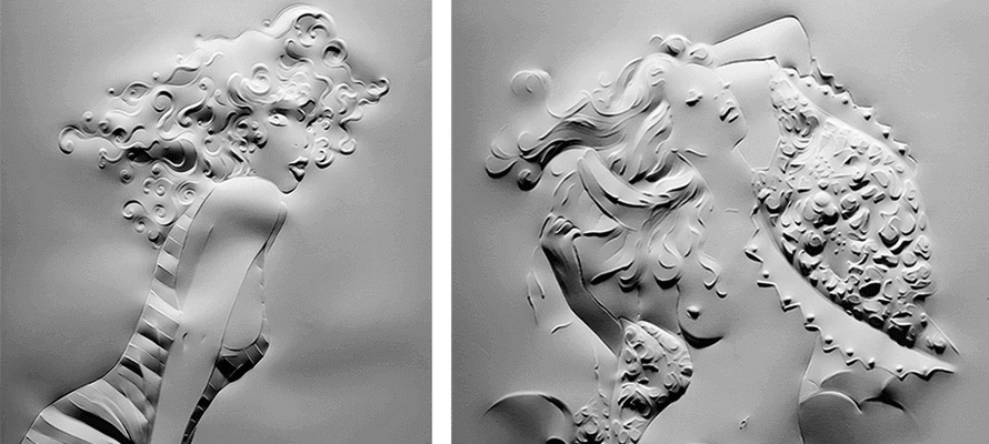 Queste opere in rilievo sono il risultato di una mia tecnica nuova che ho scoperto poco tempo fa. L’idea da cui nascono è quella di voler dare volume alla carta. Il volume nasce dalla luce e dalle ombre, la tridimensionalità fa vivere questi disegni.