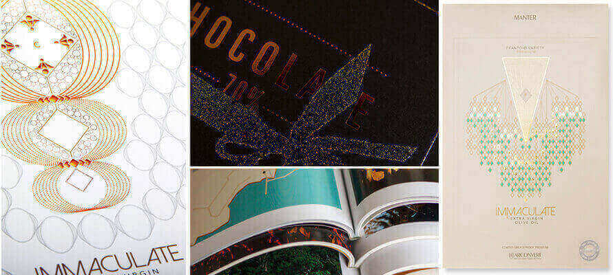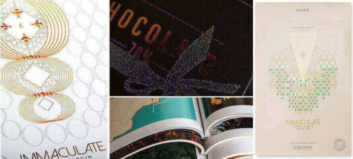 But the beauty of paper comes in its creative, high-performance and very communicative versions. Here you are spoilt for choice with types, colourings and finishes. These are still industrial products, but they maintain the feeling of craftsmanship that standard or consumer papers do not have. Traditionally, they are divided into marked, laid and embossed. In general, they are all characterised by a surface that is not smooth but marked by a texture, and they have a rough and textured appearance. The markings have bas-relief motifs imprinted with felt during the sheet formation phase in the paper mill. As the grammage increases, the marking also becomes very sharp. This is the case with Modigliani Bianca/Neve (Gruppo Cordenons) or Tintoretto Gesso (Fedrigoni), a natural paper made of pure cellulose, “crisp” to the touch, marked with felt on both sides: the surface pattern is light and uniform and seems like “orange peel”. It lends itself to the creation of bookshop editions, brochures, pamphlets, and coordinated graphic materials but also menus, invitations and greeting cards. The laid papers can be recognised thanks to a regular, more or less thick weave, made up of vertical stripes, called wire marks, or horizontal multi-stripes, called ‘catenelle’ (chains). The effect achieved is a chiaroscuro that has only an aesthetic function. They are particularly suitable for luxury editions, monographs, brochures, inserts and catalogues, and are used in paper-making and bookbinding. There are also laid papers in adhesive versions for food use, such as wine labels. Examples are the Label Stucco Corolla by Fedrigoni in white and ivory versions and the Constellation Snow by Arconvert. Care should be taken not to confuse kraft paper, which appears to be laid, with ‘artistic’ laid papers. We’ll look at it later, but packaging paper has remarkable physical qualities that go beyond its raw appearance. Embossed papers are blind embossed through the goffering process by which an embossed design is reproduced on paper, such as the texture of leather, the grain of wood, a mark, geometric or creative figures, through a cliché with the help of pressure and possibly heat. This is done through two rollers, one of steel and the other covered with paper or cotton, which imprint a more regular pattern than the marked ones, but with a much greater variety than the laid paper that only has vertical or horizontal patterns. This paper, also known as embossed, can be produced on commission to obtain textured, striped, hammered, geometric effects inspired by natural textures: finishes that are chosen above all for packaging because they can convey unique, three-dimensional tactile sensations that add more value to the print. Remember, however, that altering the flatness of the paper also means changing the way it reflects light and consequently, the colour or degree of gloss.