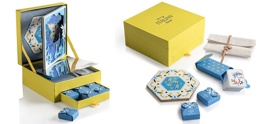 Questa gift box è realizzata completamente in cartotecnica insieme agli incastri che alloggiano le piccole sorprese pensate per il gradito ospite. Prima fra tutte una maiolica stampata in esacromia con UV Led e con taglio esagonale realizzato da un marmista tramite una fresatura ad acqua; l’esagono in ceramica e i suoi colori si riflettono poi su un pannello realizzato in PVC accoppiato a una pellicola a specchio, su cui sono stampati, sempre tramite tecnologia UV Led il claim “It’s my Italian time” e un QR code. Continuando a scoprire i segreti della box e sollevando questo pannello troviamo due alloggi: uno per la pochette in tela, l’altro per le carte da gioco e i biscotti.