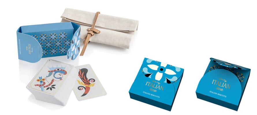 Con lo stesso materiale e tecnica degli astucci delle carte sono stati realizzati quelli dei biscotti, successivamente avvolti in una carta velina stampata con tecnologia offset-digitale con un pattern che riprende il logo dell’intera campagna.