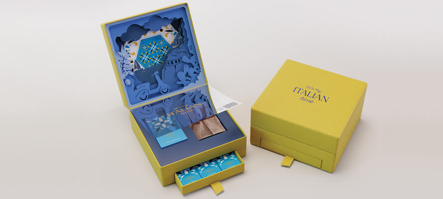 Questa gift box è realizzata completamente in cartotecnica insieme agli incastri che alloggiano le piccole sorprese pensate per il gradito ospite. Prima fra tutte una maiolica stampata in esacromia con UV Led e con taglio esagonale realizzato da un marmista tramite una fresatura ad acqua; l’esagono in ceramica e i suoi colori si riflettono poi su un pannello realizzato in PVC accoppiato a una pellicola a specchio, su cui sono stampati, sempre tramite tecnologia UV Led il claim “It’s my Italian time” e un QR code. Continuando a scoprire i segreti della box e sollevando questo pannello troviamo due alloggi: uno per la pochette in tela, l’altro per le carte da gioco e i biscotti.