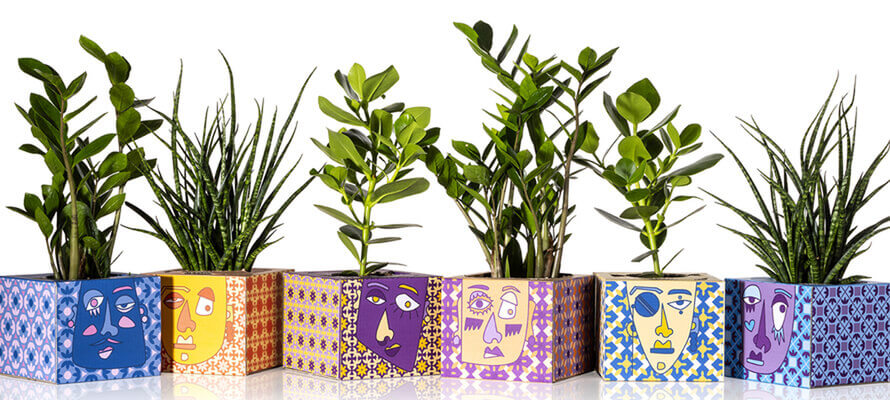 Grande fan della stampa digitale, O,nice! ha lavorato con ICO per sfruttare tutte le opportunità che offre: ben oltre la semplice produzione di piccole tirature, la stampa digitale permette oggi di sfruttare versioning e variabilità in modi mai sperimentati prima. ICO ha ingegnerizzato l’intero pack nelle sue diverse componenti per assicurare il trasporto delle piante nella corretta posizione. Le scatole sono state stampate sui fogli di cartone ondulato, realizzati internamente in onda B con copertina esterna bianca e copertina interna color avana. La stampa è stata realizzata tramite stampante digitale single pass e, per gestire le diverse varianti sia di grafica che di fustella, è stato preparato un file multipagina VDP (stampa dato variabile) per permettere di ottenere decine e decine di stampati unici combinando forme, oggetti, colori e pattern in varianti sempre nuove. Direttamente in macchina è stata applicata una vernice di sovrastampa a scopo protettivo. I campioni sono stati realizzati utilizzando un plotter e sfruttando il tracciato fustella come percorso di taglio e cordonatura.