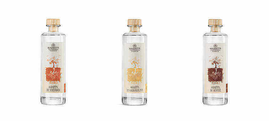 La distilleria Mazzetti d’Altavilla, fondata nel 1846, per la sua collezione di tre grappe unite dall’evocativo nome “Radici”, ha scelto la strada della valorizzazione dell’heritage (antichi vitigni autoctoni del Monferrato) e dell’attenzione all’impatto ambientale per le fasi produttive realizzate tutte in loco. La collezione “Radici” introduce un tocco di originalità nella proposta di grappe giovani e in purezza. Se per la bottiglia la scelta è caduta su un design estremamente essenziale, un cilindro in vetro flint con una solida base, per le etichette lo studio ha attinto ispirazione dal paesaggio del Monferrato, ricomponendo diversi elementi simbolici in una visione d’insieme. Il filo conduttore è il richiamo sensoriale, soprattutto tattile e visivo alle terre del Monferrato. È così stata privilegiata una carta adesiva FSC, ad alto spessore e con le venature delle fibre bene in vista. Per fornire informazioni dettagliate si è scelto di sfruttare la parte adesiva dell’etichetta rendendo agevole la lettura attraverso il vetro della bottiglia. La palette di colori delle etichette riporta fedelmente le variazioni micro-locali in funzione del vitigno di riferimento: Grappa di Malvasia predilige il marrone chiaro, la Grappa di Grignolino i toni del giallo che evoca la Pietra da Cantone, la Grappa di Ruché vira decisamente sul marrone scuro. La tattilità dell’etichetta è ulteriormente esaltata dalla rocky varnish che delinea a rilievo il disegno dell’albero e del suo doppio proiettato in forma di radici. A unificare le tre bottiglie interviene un tappo in legno rustico. La collezione prevede un packaging secondario, ovvero un tubo in cartone kraft robusto e riciclabile, decorato da etichette che richiamano le tre tipologie di grappe “Radici”.