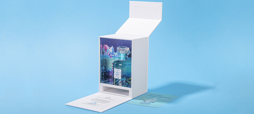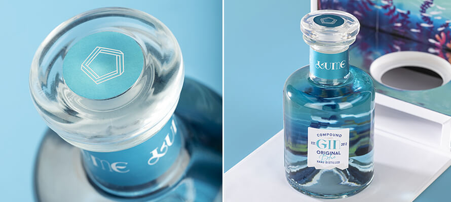 Dal punto di vista tecnico, “Lume – Spirito degli Abissi” combina tecniche di stampa avanzate che arricchiscono il tema degli abissi marini, metafora dell’esplorazione dell’esperienza umana. La retro etichetta, che simula il fondale marino all’interno della bottiglia, è stata realizzata accoppiando carta con un film plastico trasparente di UPM Raflatac, prodotto con plastiche raccolte in oceano e successivamente riciclate, dal nome Ocean Action. Il cofanetto esterno è impreziosito da una doppia laminazione a caldo di Luxoro KURZ e da un rivestimento interno specchiato, che amplifica la narrazione visiva. Infine il packaging primario è stato affidato alla competenza di Vetroelite e Vinolok, rispettivamente per la bottiglia e la chiusura in vetro Philos, della gamma Edge.