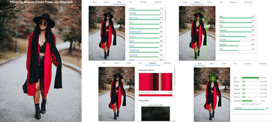 Alla pagina Google mette a disposizione un simulatore del suo Vision AI. Nella foto, in pochi secondi, riconosce che c’è una persona, nello specifico una donna, e che indossa un cappello (addirittura riconosce che è una fedora), un cappotto e delle collane. A ciascun dettaglio individuato assegna un tasso di riconoscimento e così l’algoritmo ci dice che ci sono delle scarpe al 94%, degli occhiali da sole all’87%. Ma non si ferma qui, associa delle etichette (borsa, alberi, trench, fashion), classifica le espressioni facciali (joy), verifica quanto l’immagine sia sicura rispetto a contenuti sensibili (sesso, violenza, contenuti razziali), crea una mappa dei colori con i valori in RGB e la loro copertura in percentuali ed esclude i colori di fondo per evitare falsi positivi. Infine, isola le singole parti e ne mappa le coordinate. Già questo piccolo esperimento svela le potenzialità dello strumento. Dategli in pasto tutte le immagini dei vostri prodotti e insegnategli a riconoscere i dettagli che vi interessano, correggetelo quando sbaglia e vi ritroverete una moltitudine di dati da usare. Come? Prendiamo un e-commerce di moda: sfruttando questi dati, potrei costruire una gallery in base ai colori, distinguere foto indossate da still-life, spingere capi con il logo in determinati mercati o verso particolari utenti che apprezzano questi dettagli, aggregare in base al tipo di prodotto o di genere, e così via senza che nessuno abbia speso tempo a classificare le immagini e, cosa altrettanto importante, senza che nessuno abbia predeterminato cosa cercare. E questo equivale a esplorare aree di business nuove o non considerate.
