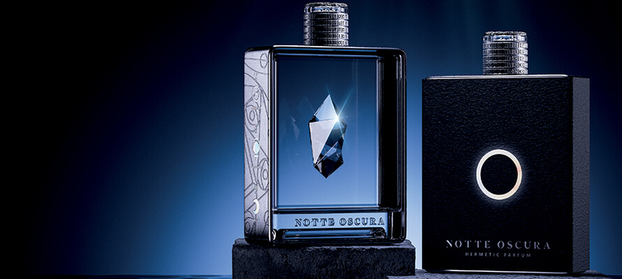 Dario Frattaruolo Design Studio (Italy) which proposes a concept entitled Notte Oscura – Hermetic Perfume. The bottle is made of high-quality glass and metal and decorated with mother-of-pearl icons. Using the effects of light and transparency, a play of reflections is created which characterizes the minimalist design but full of hidden meanings. Dario Frattaruolo has chosen to experiment with different types of materials, which blend harmoniously creating a unique sensorial experience. The square shape and clean lines of the bottle give the packaging both elegance and an aura of mystery: it seems to contain a magical elixir that gives charm to the wearer. The label has an intense black nuance that represents the darkness of the night. The idea was precisely to communicate a feeling of mystery. It was also about choosing black as the primary color and combining Avery Dennison paper with high-quality manufacturing techniques and materials. The concept of the dark night of the soul comes from the Carmelites. Then taken up by transmutational alchemists it was subsequently used in psychology. The dark night coincides with the moment in which the mind collapses due to trauma or an existential problem, generating awareness. When the “psycho-spiritual” transformation process reaches its culmination, the final phase of solitude begins which it is necessary to face to be closer to God.