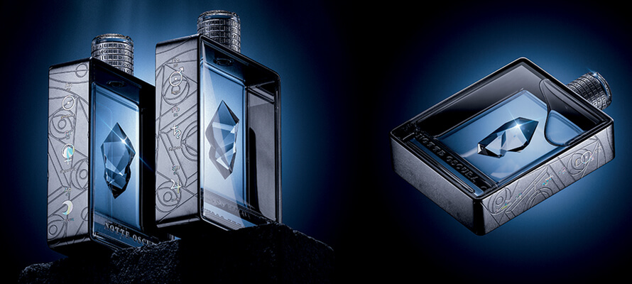 Dario Frattaruolo Design Studio (Italy) which proposes a concept entitled Notte Oscura – Hermetic Perfume. The bottle is made of high-quality glass and metal and decorated with mother-of-pearl icons. Using the effects of light and transparency, a play of reflections is created which characterizes the minimalist design but full of hidden meanings. Dario Frattaruolo has chosen to experiment with different types of materials, which blend harmoniously creating a unique sensorial experience. The square shape and clean lines of the bottle give the packaging both elegance and an aura of mystery: it seems to contain a magical elixir that gives charm to the wearer. The label has an intense black nuance that represents the darkness of the night. The idea was precisely to communicate a feeling of mystery. It was also about choosing black as the primary color and combining Avery Dennison paper with high-quality manufacturing techniques and materials. The concept of the dark night of the soul comes from the Carmelites. Then taken up by transmutational alchemists it was subsequently used in psychology. The dark night coincides with the moment in which the mind collapses due to trauma or an existential problem, generating awareness. When the “psycho-spiritual” transformation process reaches its culmination, the final phase of solitude begins which it is necessary to face to be closer to God.